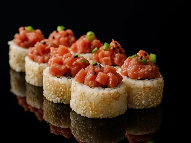 • рис, нори (морские водоросли); • тунец; • сливочный сыр; • пекинский салат; • кунжут; • соус Ким Чи; • зеленый лук. ✔️ в комплектации заказа входит: васаби , маринованный имбирь, соевый соус. ✔️ палочки по количеству персон