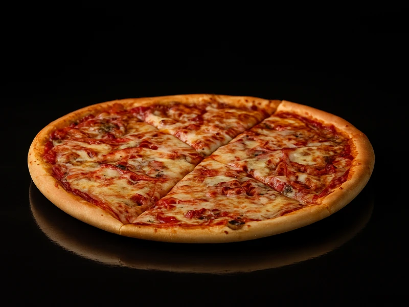тесто холодной ферментации (мука, вода, соль, сахар, растительное масло, дрожжи), итальянский соус (томаты, базилик, орегано, лук, натуральные специи, оливковое масло), натуральный полутвердый сыр Моцарелла, колбаса варено копченая, помидоры, перец Болгарский, свежие шампиньоны